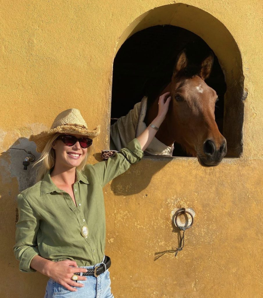 Nystrøken skjorte, en bukse med pent snitt, loafers, statementveske og selvfølgelig Afrodite-smykker.